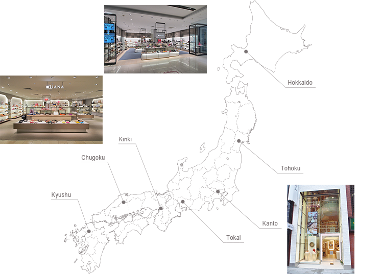 ダイアナグループは、首都圏をはじめ全国の主要都市に80を超える店舗を展開しています。ダイアナの独自性は各店舗をマーケティングの拠点としているところ。「マーケティングの拠点はショップである」という基本ポリシーを軸に、お客様のニーズを的確に把握し、それをもとにさまざまな役割を担うスタッフが有機的に連携して事業を展開していることが、ダイアナの最大の強みです。